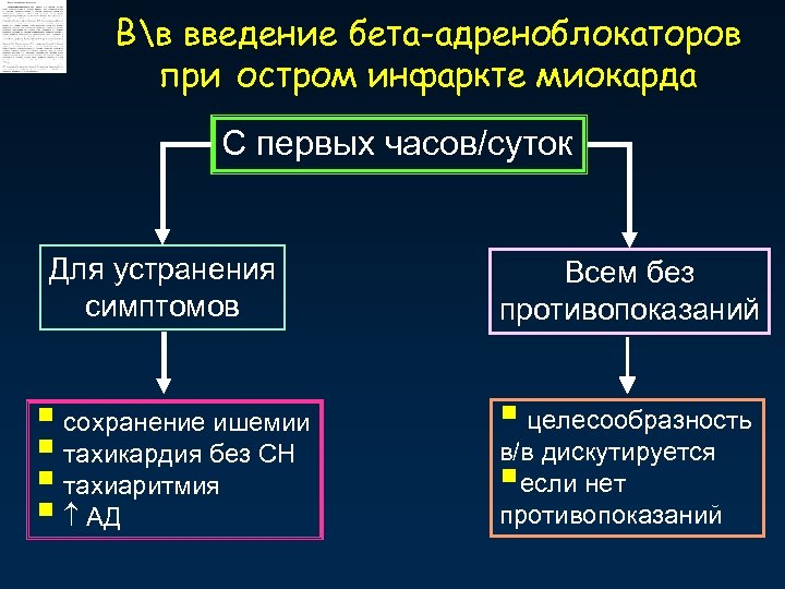 Вв введение бета-адреноблокаторов при остром инфаркте миокарда C первых часов/суток Для устранения симптомов § сохранение ишемии § тахикардия без СН § тахиаритмия § АД Всем без противопоказаний § целесообразность в/в дискутируется §если нет противопоказаний