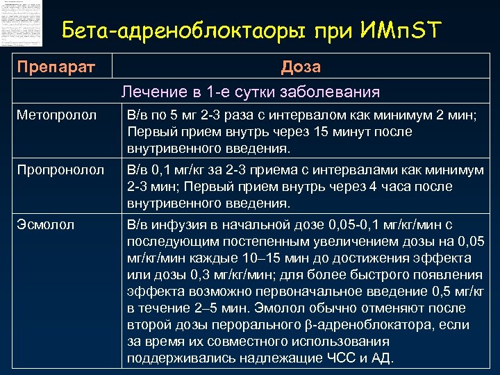 Бета-адреноблоктаоры при ИМп. ST Препарат Доза Лечение в 1 -е сутки заболевания Метопролол В/в по 5 мг 2 -3 раза с интервалом как минимум 2 мин; Первый прием внутрь через 15 минут после внутривенного введения. Пропронолол В/в 0, 1 мг/кг за 2 -3 приема с интервалами как минимум 2 -3 мин; Первый прием внутрь через 4 часа после внутривенного введения. Эсмолол В/в инфузия в начальной дозе 0, 05 -0, 1 мг/кг/мин с последующим постепенным увеличением дозы на 0, 05 мг/кг/мин каждые 10– 15 мин до достижения эффекта или дозы 0, 3 мг/кг/мин; для более быстрого появления эффекта возможно первоначальное введение 0, 5 мг/кг в течение 2– 5 мин. Эмолол обычно отменяют после второй дозы перорального -адреноблокатора, если за время их совместного использования поддерживались надлежащие ЧСС и АД.