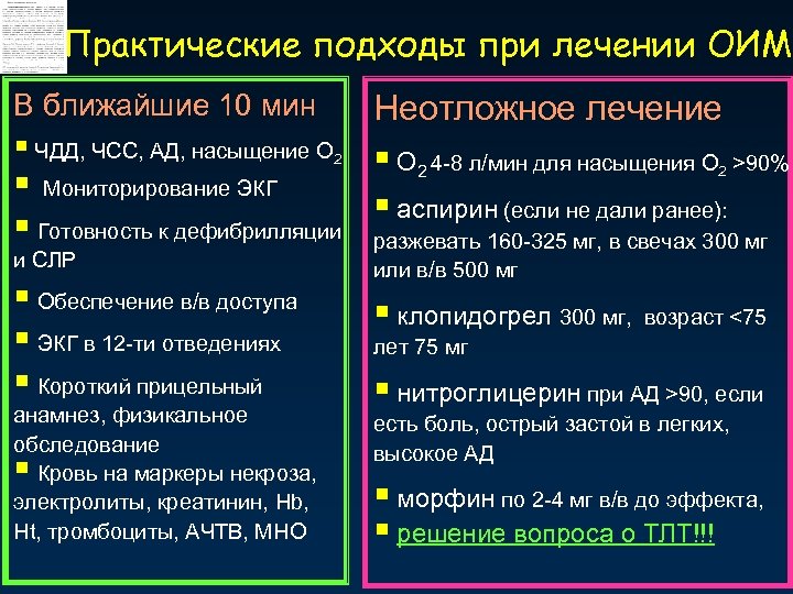 Практические подходы при лечении ОИМ В ближайшие 10 мин Неотложное лечение § ЧДД, ЧСС, АД, насыщение O 2 § O 4 -8 л/мин для насыщения O >90% 2 2 § Мониторирование ЭКГ § аспирин (если не дали ранее): § Готовность к дефибрилляции разжевать 160 -325 мг, в свечах 300 мг и СЛР § Обеспечение в/в доступа § ЭКГ в 12 -ти отведениях § Короткий прицельный анамнез, физикальное обследование Кровь на маркеры некроза, электролиты, креатинин, Hb, Ht, тромбоциты, АЧТВ, МНО § или в/в 500 мг § клопидогрел 300 мг, возраст <75 лет 75 мг § нитроглицерин при АД >90, если есть боль, острый застой в легких, высокое АД § морфин по 2 -4 мг в/в до эффекта, § решение вопроса о ТЛТ!!!