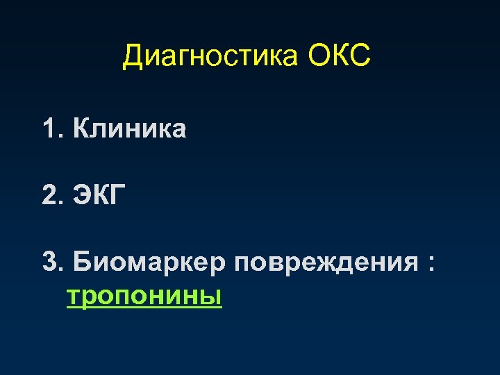 Диагностика ОКС 1. Клиника 2. ЭКГ 3. Биомаркер повреждения : тропонины