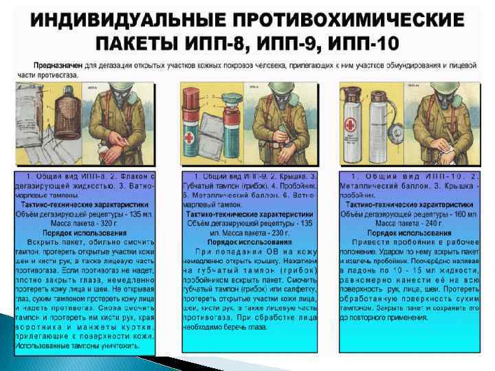 Пакет перевязочный индивидуальный для оказания первой медицинской помощи при ранениях и ожогах. В полевых условиях пакет имеется в снаряжении каждого военнослужащего, в том числе каждого медика. 1) 2) марлевого бинта (10 см х 7 м) и двух ватно-марлевых подушечек (17. 5 х 32 см), одна из которых фиксирована на расстоянии 12— 17 см от конца бинта, а другую можно передвигать по бинту на нужное расстояние. Бинт с ватно-марлевыми подушечками завёрнут в пергаментную бумагу, в складку которой вложена безопасная булавка, и упакован в герметическую наружную оболочку из прорезиненной ткани, стойко сохраняющую стерильность содержимого. На оболочке пакета напечатана краткая инструкция и дата изготовления.