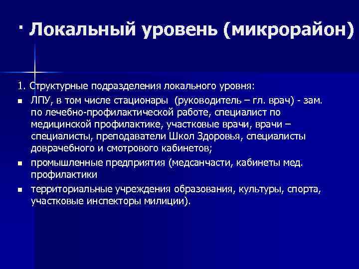 · Локальный уровень (микрорайон) 1. Структурные подразделения локального уровня: n ЛПУ, в том числе стационары (руководитель – гл. врач) - зам. по лечебно-профилактической работе, специалист по медицинской профилактике, участковые врачи, врачи – специалисты, преподаватели Школ Здоровья, специалисты доврачебного и смотрового кабинетов; n промышленные предприятия (медсанчасти, кабинеты мед. профилактики n территориальные учреждения образования, культуры, спорта, участковые инспекторы милиции).