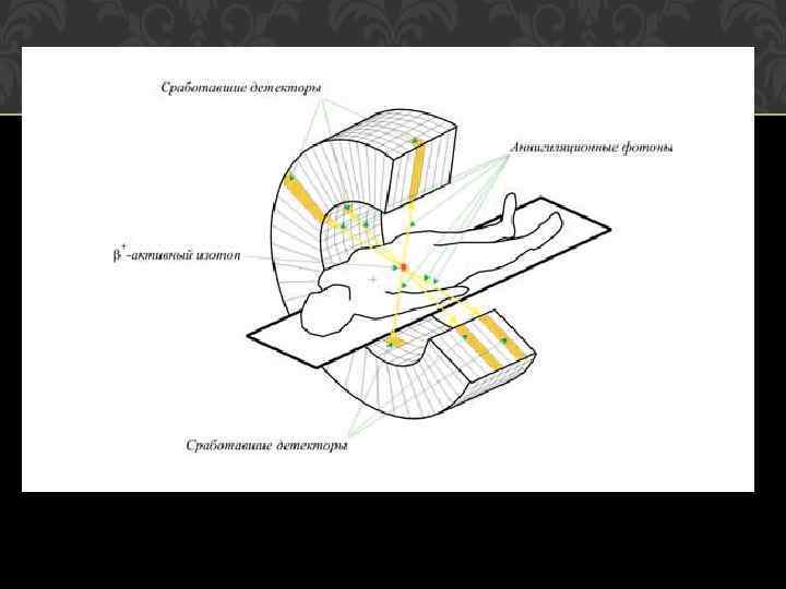 ПОЗИТРОННО-ЭМИССИОННАЯ ТОМОГРАФИЯ (ПЭТ) Радионуклидный томографический метод исследования внутренних органов человека. Метод основан на регистрации пары гаммаквантов, возникающих при аннигиляции позитронов. Позитроны возникают при позитронном бета-распаде радионуклида, входящего в состав радиофармпрепарата, который вводится в организм перед исследованием.