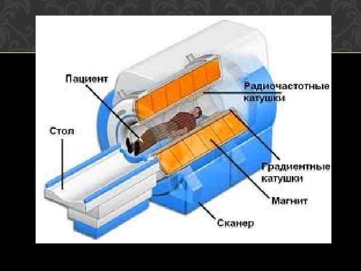 МАГНИТНО-РЕЗОНАНСНАЯ ТОМОГРАФИЯ(МРТ) МРТ-томографический метод исследования внутренних органов и тканей с использованием физического явления ядерного магнитного резонанса(ЯМР) ЯМР-измерение электромагнитного отклика ядер атомов водорода на возбуждение их определённой комбинацией электромагнитных волн в постоянном магнитном поле высокой напряжённости.