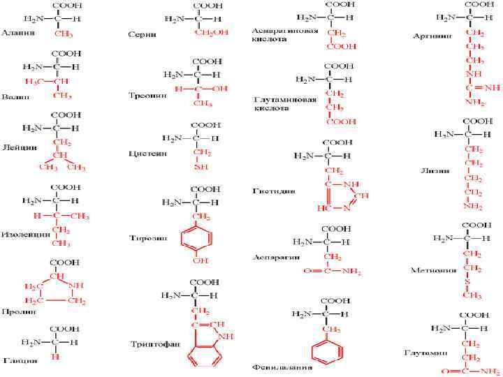 Аланин Аргинин Аспарагиновая кислота Аспарагин Валин Гистидин Глицин Глутаминовая кислота Глутамин Изолейцин Лизин Метионин Пролин Серин Тирозин Треонин Триптофан Фенилаланин Цистеин