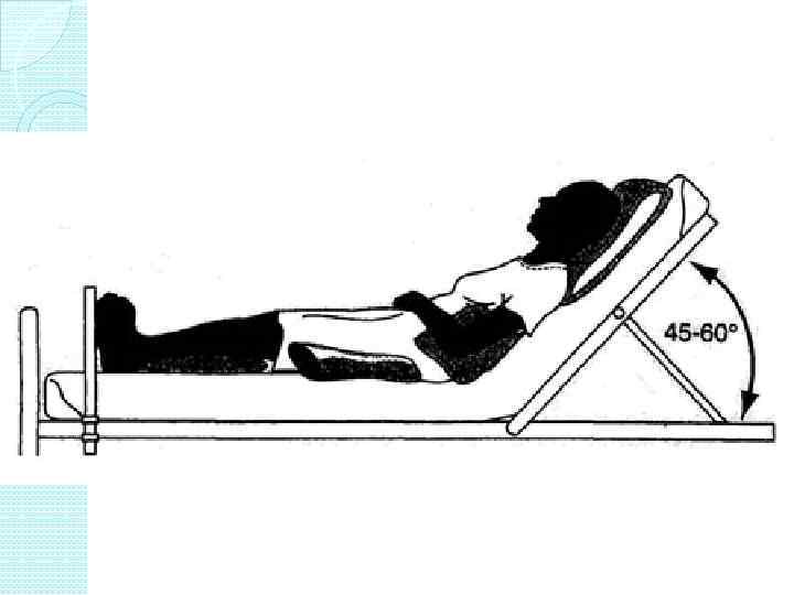 Дренажное положение Применяется для отделения мокроты самотеком. 1. Поднять ножной конец кровати на 20 - 30 см выше уровня пола, использовать устойчивые подставки. 2. Наблюдать за состоянием пациента в постели. Убедиться, что увеличилось отхождение мокроты при появлении кашля. 3. Повторить процедуру несколько раз с перерывом 10 - 15 минут. 4. Придать кровати обычное положение.