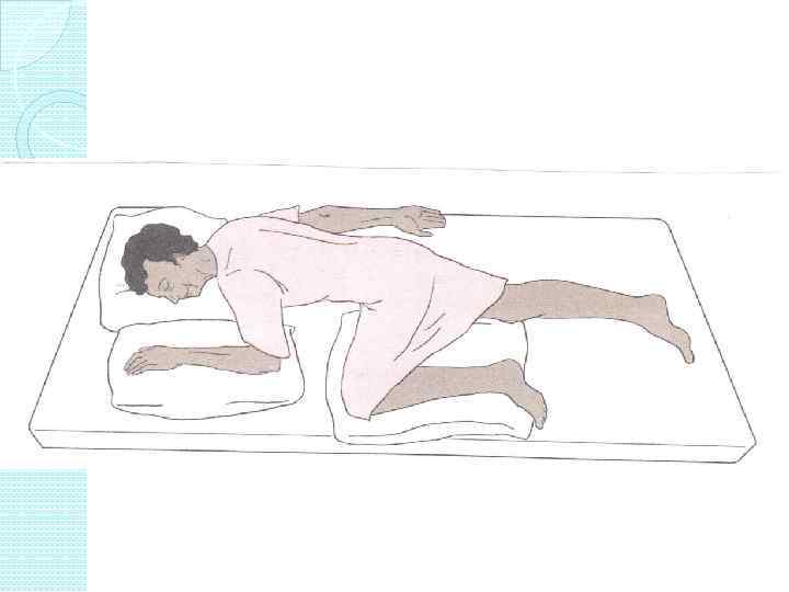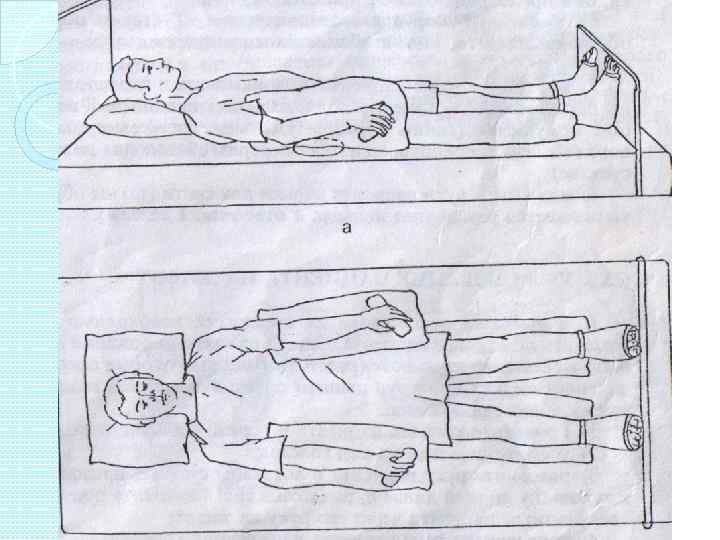 Положение на спине 1. Опустить изголовье кровати (убрать лишние подушки), придать постели горизонтальное положение. Убедиться, что пациент лежит посередине кровати. 2. Придать пациенту правильное положение: положить подушку под голову, расположить руки вдоль туловища ладонями вниз, расположить нижние конечности на одной линии с тазобедренными суставами. 3. Подложить небольшую подушку под верхнюю часть плеч и шею. 4. Подложить валики из скатанной в рулон простыни вдоль наружной поверхности бедер, начиная от области большого вертела бедренной кости. 5. Подложить небольшую подушку или валик под голень в области ее нижней трети. 6. Обеспечить упор для поддерживания стоп под углом 90°. 7. Положить под предплечье небольшие подушки.