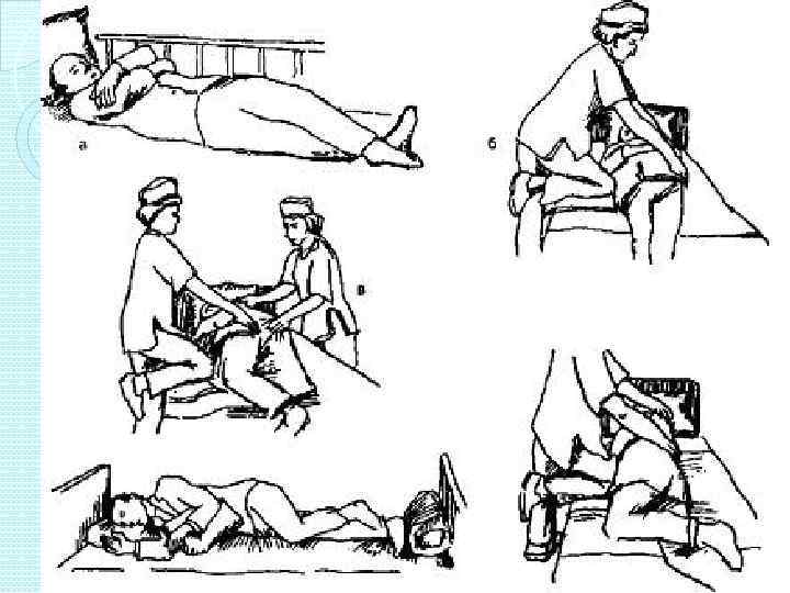 Положение Симса – это промежуточное положение между положением лёжа на животе и лёжа на боку. 1. Придать изголовью постели горизонтальное положение. 2. Положить пациента на спину. 3. Перевести пациента в положение лёжа на боку и частично на животе. 4. Положить подушку под голову пациента для предотвращения бокового сгибания шеи. 5. Подложить под согнутую «верхнюю» руку подушку на уровне плеча. Другую руку положить на матрац. 6. Под согнутую «верхнюю» ногу подложить подушку, чтобы нога оказалась на уровне бедра. 7. Положить мешок с песком у подошвы ноги, обеспечив тем самым тыльный сгиб стопы и профилактику ее отвислости. 8. Проверить выпрямленность тела пациента. Выяснить, удобно ли ему. 9. Опустить постель и поднять поручни, обеспечив безопасность пациенту. 10. Вымыть руки.