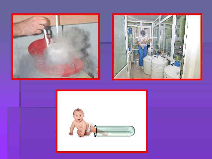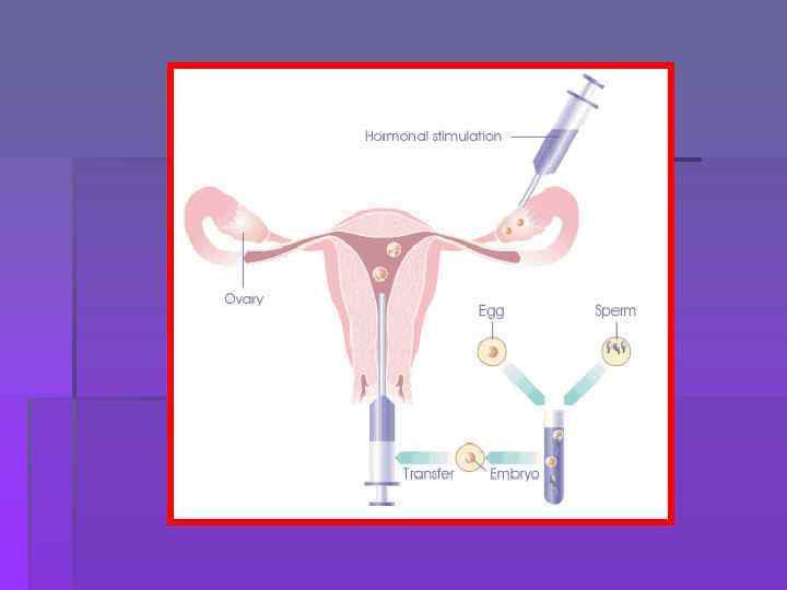 § § § Виды вспомогательных репродуктивных технологий Суррогатное материнство (вынашивание эмбриона женщиной для последующей передачи ребенка генетическим родителям) Криоконсервация ооцитов и эмбрионов Предимплантационная диагностика наследственных болезней Хэтчинг (рассечение блестящей оболочки эмбриона перед имплантацией в матку) Редукция эмбрионов при многоплодной беременности