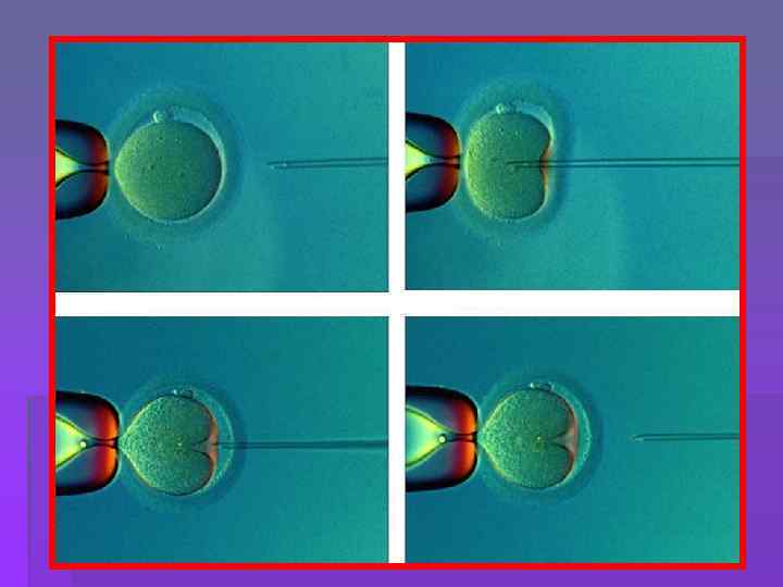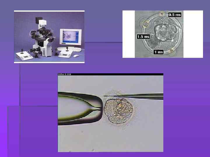 § Анеуплоидии (патологии, связанные с аномалиями числа хромосом) встречаются у 0. 3% всех новорожденных, в 25% всех спонтанных абортов, в 50 -60% спонтанных абортов первого триместра беременности. § Обычно ПГД выполняется на трехдневных эмбрионах, которые в это время состоят из 5 -10 бластомеров. С помощью специальных микроманипуляторов при 400 -х кратном увеличении очень аккуратно проводится биопсия (взятие одного или двух бластомеров). Далее бластомеры исследуют с помощью FISH (флуоресцентная гибридизация) для выявления хромосомных патологий и с помощью ПЦР (полимеразная цепная реакция) для моногенных наследственных заболеваний. Эмбрионы же после биопсии культивируют в специальных средах до стадии морулы или бластоцисты. После выполнения FISH или ПЦР анализа отбирают здоровые эмбрионы для переноса их в полость матки.