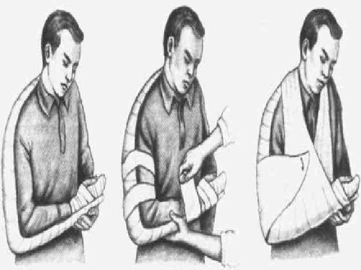 1 З. Поврежденная рука должна быть в физиологическом положении: в локтевом суставе прямой угол, плечо несколько отведено от туловища (вложить в подмышечную впадину валик), ладонь повернута к туловищу, пальцы полусогнуты. 14. Костные выступы и суставы изолировать прокладками. 15. Шину, которая расположена от основания пальцев к надплечью здоровой стороны, фиксировать к кисти, предплечью и плечу спиральной повязкой, а в области плечевого сустава – колосовидной.