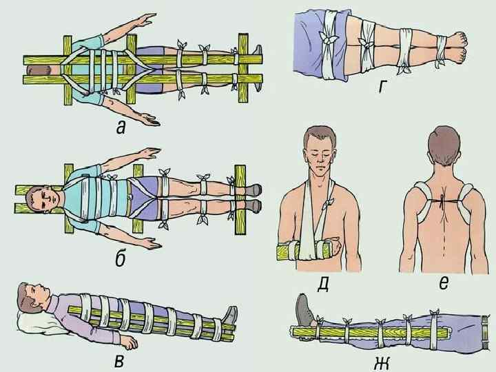 При иммобилизации соблюдают следующие правила: шина должна фиксировать не менее двух суставов, а при переломе бедра – все суставы нижней конечности, следствием ошибки является обычно смещение отломков во время транспортировки пациента. шину накладываю т поверх одежды и обуви, которые п ри необходимости разрезают; перед наложением шины ее необходимо подогнать под размер поврежденной конечности. для предупрежде ни сдавливания ткан я ей в местах костных выступов накладывают мягк ий материал; шину нельзя накладывать с то й стороны, где выступает сломанная кость. Концы пальцев, если они не повреждены, оставляют открытыми для контроля за кровообращение м.