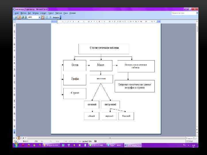 • Статистические таблица, содержащая сводную число вую характеристику исследуемой совокупности по одному или не скольким существенным признакам, взаимосвязанным логикой экономического анализа. • Значение статистических таблиц состоит в том, что они позволяют наглядно и целостно охватить материалы статистической сводки. • По внешнему виду статистическая таблица представляет собой ряд пересекающихся горизонтальных и вертикальных линий, образующих по горизонтали строки, а по вертикали графы (столбцы, колон ки), которые в совокупности составляют как бы скелет таблицы.