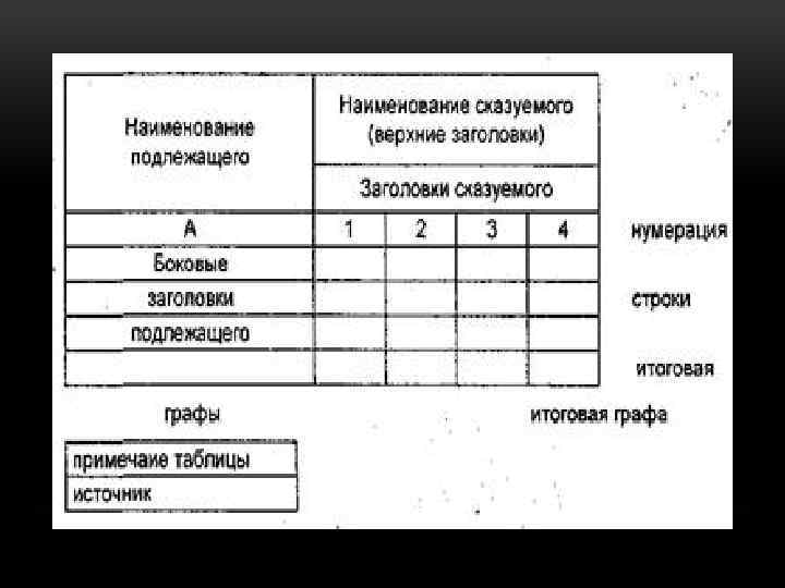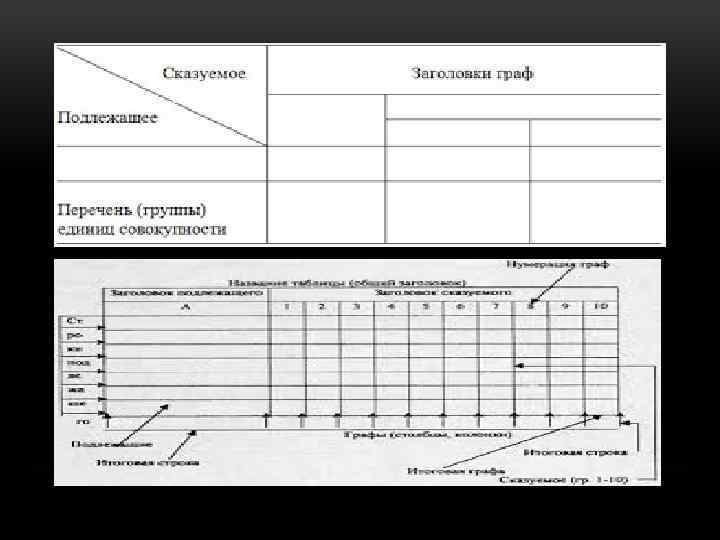 • Каждая статистическая таблица имеет подлежащее и сказуемое. • Подлежащее таблицы это объект изучения(название района, города; предприятия), характеризующийся количественными ха рактеристиками. • Сказуемое таблицы это система показателей, которыми харак теризуется объект изучения таблицы. • Помимо общего наименования статистическая таблица содержит также верхние заголовки, которые характеризуют содержание граф, и боковые содержание строк таблицы.