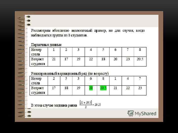 СРЕДНИЕ ВЕЛИЧИНЫ • Мода наиболее частая варианта (Мо) • Медиана варианта, расположенная посредине ряда (Ме) • Средняя арифметическая (М)
