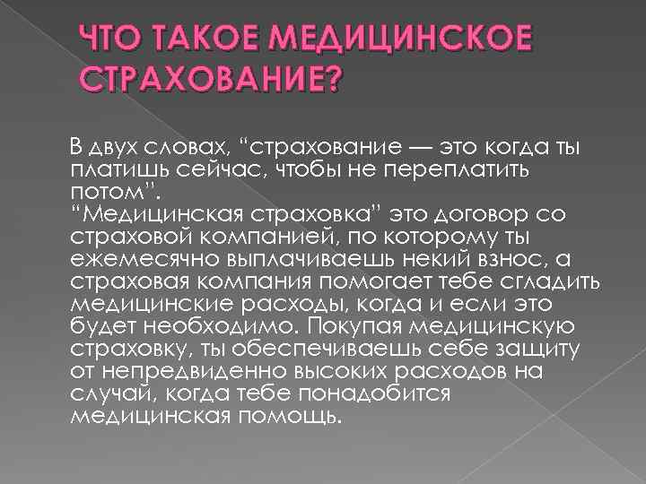 ЧТО ТАКОЕ МЕДИЦИНСКОЕ СТРАХОВАНИЕ? В двух словах, “страхование — это когда ты платишь сейчас, чтобы не переплатить потом”. “Медицинская страховка” это договор со страховой компанией, по которому ты ежемесячно выплачиваешь некий взнос, а страховая компания помогает тебе сгладить медицинские расходы, когда и если это будет необходимо. Покупая медицинскую страховку, ты обеспечиваешь себе защиту от непредвиденно высоких расходов на случай, когда тебе понадобится медицинская помощь.