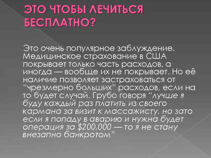 ЭТО ЧТОБЫ ЛЕЧИТЬСЯ БЕСПЛАТНО? Это очень популярное заблуждение. Медицинское страхование в США покрывает только часть расходов, а иногда — вообще их не покрывает. Но её наличие позволяет застраховаться от “чрезмерно больших” расходов, если на то будет случай. Грубо говоря “лучше я буду каждый раз платить из своего кармана за визит к массажисту, но зато если я попаду в аварию и нужна будет операция за $200, 000 — то я не стану внезапно банкротом”
