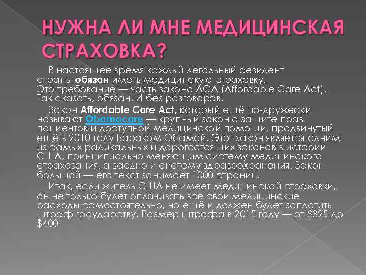 НУЖНА ЛИ МНЕ МЕДИЦИНСКАЯ СТРАХОВКА? В настоящее время каждый легальный резидент страны обязан иметь медицинскую страховку. Это требование — часть закона ACA (Affordable Care Act). Так сказать, обязан! И без разговоров! Закон Affordable Care Act, который ещё по-дружески называют Obamacare — крупный закон о защите прав пациентов и доступной медицинской помощи, продвинутый ещё в 2010 году Бараком Обамой. Этот закон является одним из самых радикальных и дорогостоящих законов в истории США, принципиально меняющим систему медицинского страхования, а заодно и систему здравоохранения. Закон большой — его текст занимает 1000 страниц. Итак, если житель США не имеет медицинской страховки, он не только будет оплачивать все свои медицинские расходы самостоятельно, но ещё и должен будет заплатить штраф государству. Размер штрафа в 2015 году — от $325 до $400