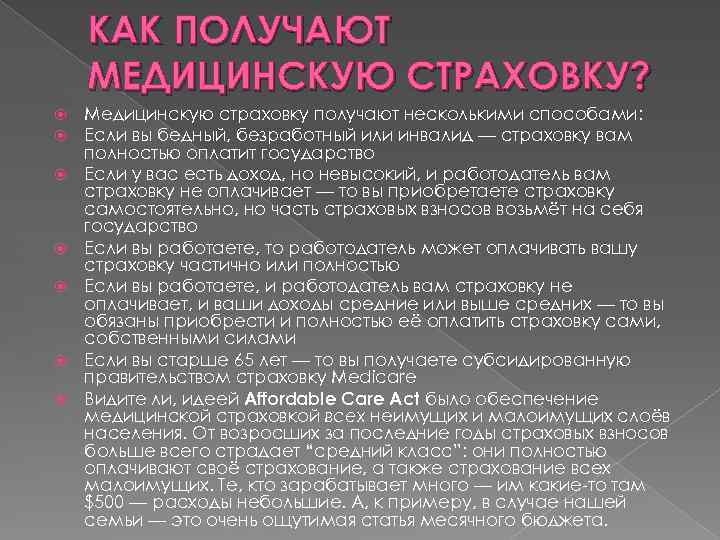 КАК ПОЛУЧАЮТ МЕДИЦИНСКУЮ СТРАХОВКУ? Медицинскую страховку получают несколькими способами: Если вы бедный, безработный или инвалид — страховку вам полностью оплатит государство Если у вас есть доход, но невысокий, и работодатель вам страховку не оплачивает — то вы приобретаете страховку самостоятельно, но часть страховых взносов возьмёт на себя государство Если вы работаете, то работодатель может оплачивать вашу страховку частично или полностью Если вы работаете, и работодатель вам страховку не оплачивает, и ваши доходы средние или выше средних — то вы обязаны приобрести и полностью её оплатить страховку сами, собственными силами Если вы старше 65 лет — то вы получаете субсидированную правительством страховку Medicare Видите ли, идеей Affordable Care Act было обеспечение медицинской страховкой всех неимущих и малоимущих слоёв населения. От возросших за последние годы страховых взносов больше всего страдает “средний класс”: они полностью оплачивают своё страхование, а также страхование всех малоимущих. Те, кто зарабатывает много — им какие-то там $500 — расходы небольшие. А, к примеру, в случае нашей семьи — это очень ощутимая статья месячного бюджета.