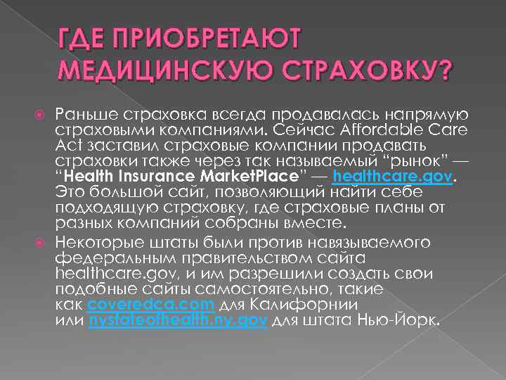 ГДЕ ПРИОБРЕТАЮТ МЕДИЦИНСКУЮ СТРАХОВКУ? Раньше страховка всегда продавалась напрямую страховыми компаниями. Сейчас Affordable Care Act заставил страховые компании продавать страховки также через так называемый “рынок” — “Health Insurance Market. Place” — healthcare. gov. Это большой сайт, позволяющий найти себе подходящую страховку, где страховые планы от разных компаний собраны вместе. Некоторые штаты были против навязываемого федеральным правительством сайта healthcare. gov, и им разрешили создать свои подобные сайты самостоятельно, такие как coveredca. com для Калифорнии или nystateofhealth. ny. gov для штата Нью-Йорк.