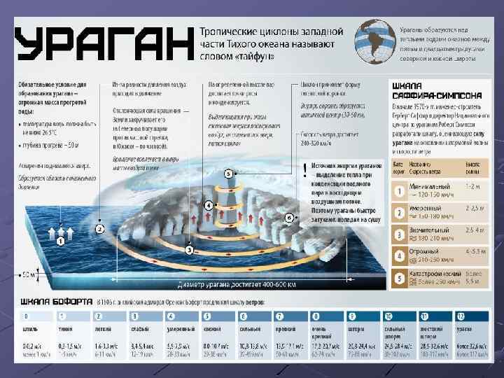 Ветровые метеорологические явления. Ураган – ветер постоянного направления, скоростью выше 35 м/сек. Смерч – воронкообразный вихрь. Тайфун – ураган огромной разрушительной силы, образующийся в океане и сопровождающийся ливневыми дождями. Ураган Смерч Тайфун