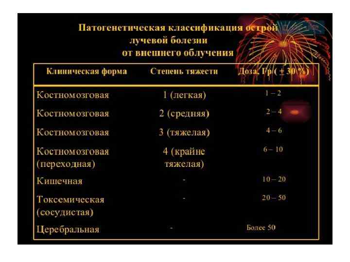 • • • Церебральная форма. При облучении в дозе свыше 50 Гр возникает церебральная форма острейшей лучевой болезни. В её патогенезе ведущая роль принадлежит поражению на молекулярном уровне клеток головного мозга и мозговых сосудов с развитием тяжёлых неврологических расстройств. Смерть наступает от паралича дыхания в первые часы или первые 2 3 сут. • Токсическая, или сосудисто-токсемическая, форма. При дозах облучения в пределах 20 25 Гр развивается ОЛБ, в основе которой лежит токсико гипоксическая энцефалопатия, обусловленная нарушением церебральной ликворогемодинамики и токсемией. При явлениях гиподинамии, прострации, затемнения сознания с развитием сопора и комы поражённые гибнут на 4 8 е сутки. • Кишечная форма. Облучение в дозе от 10 до 20 Гр ведёт к развитию лучевой болезни, в клинической картине которой преобладают признаки энтерита и токсемии, обусловленные радиационным поражением кишечного эпителия, нарушением барьерной функции кишечной стенки для микрофлоры и бактериальных токсинов. Смерть наступает на 2 й нед или в начале 3 й. • Костно-мозговая форма. Облучение в дозе 1 10 Гр сопровождается развитием костно мозговой формы ОЛБ, которая в зависимости от величины поглощённой дозы различается по степени тяжести. При облучении в дозе до 250 рад могут погибнуть 25 % облучён ных (без лечения), в дозе 400 рад до 50 % облучённых, дозу облучения 600 рад и более считают абсолютно смертельной. Хроническая лучевая болезнь общее заболевание организма, возникающее при длительном, систематическом воздействии небольших доз ионизирующего излучения (превышающих безопасные).