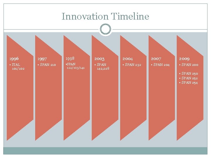 Innovation Timeline 1996 1997 1998 2003 2004 2007 2009 • ITAL 101/102 • SPAN 210 • SPAN 122/103/141 • SPAN 142, 228 • SPAN 232 • SPAN 204 • SPAN 200 • SPAN 252 • SPAN 254