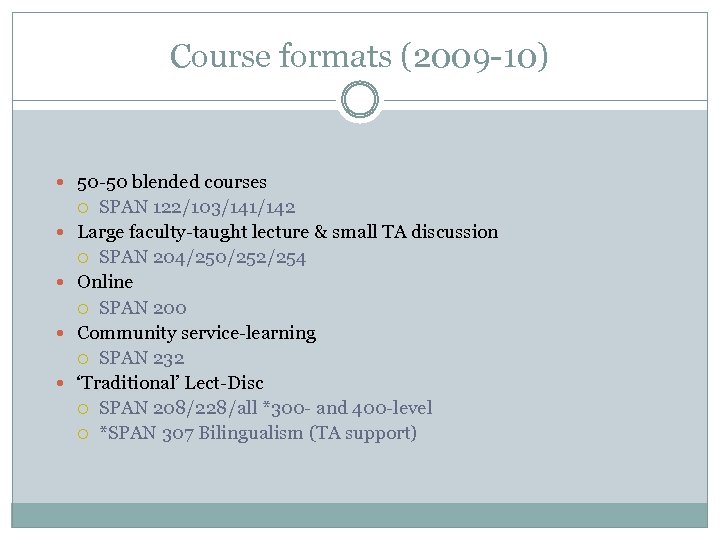 Course formats (2009 -10) 50 -50 blended courses SPAN 122/103/141/142 Large faculty-taught lecture & small TA discussion SPAN 204/250/252/254 Online SPAN 200 Community service-learning SPAN 232 ‘Traditional’ Lect-Disc SPAN 208/228/all *300 - and 400 -level *SPAN 307 Bilingualism (TA support)
