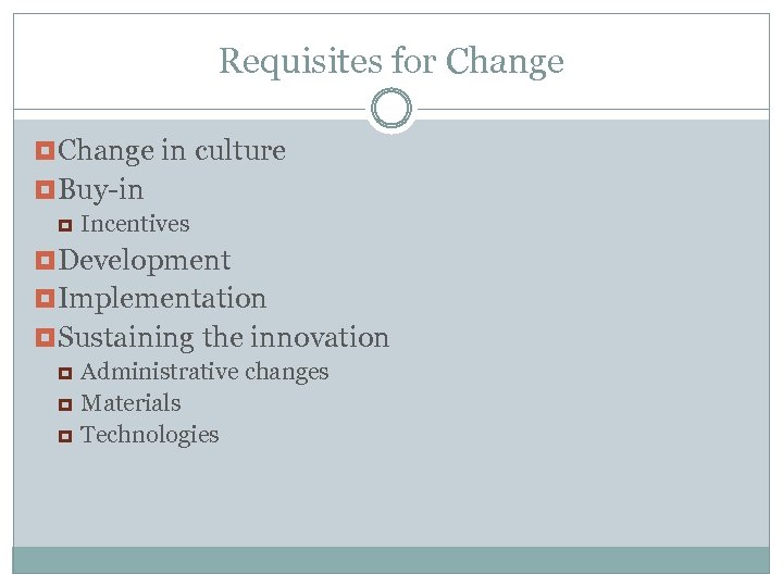 Requisites for Change in culture Buy-in Incentives Development Implementation Sustaining the innovation Administrative changes Materials Technologies