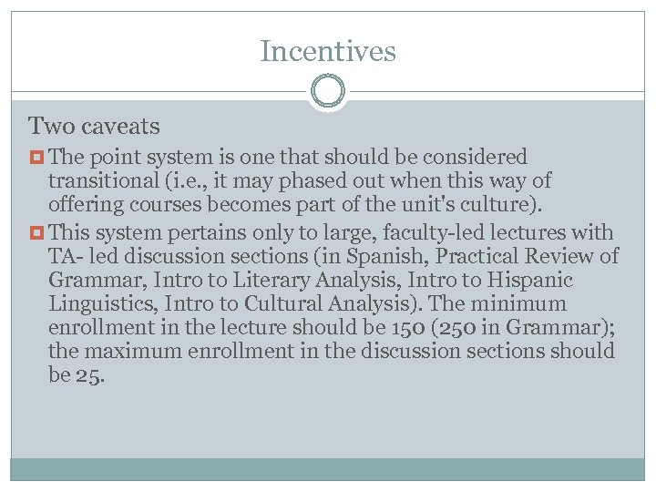 Incentives Two caveats The point system is one that should be considered transitional (i. e. , it may phased out when this way of offering courses becomes part of the unit's culture). This system pertains only to large, faculty-led lectures with TA- led discussion sections (in Spanish, Practical Review of Grammar, Intro to Literary Analysis, Intro to Hispanic Linguistics, Intro to Cultural Analysis). The minimum enrollment in the lecture should be 150 (250 in Grammar); the maximum enrollment in the discussion sections should be 25.