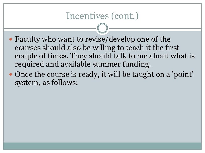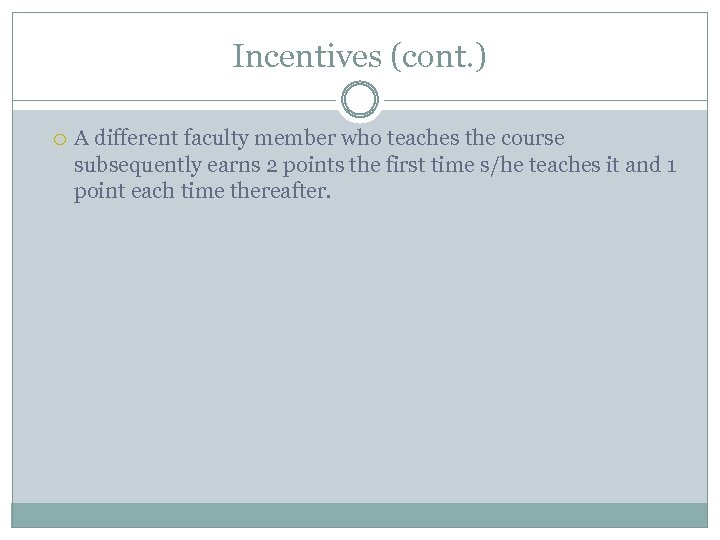 Incentives (cont. ) A different faculty member who teaches the course subsequently earns 2 points the first time s/he teaches it and 1 point each time thereafter.