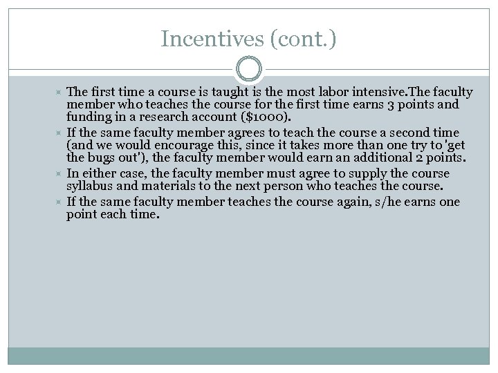 Incentives (cont. ) The first time a course is taught is the most labor intensive. The faculty member who teaches the course for the first time earns 3 points and funding in a research account ($1000). If the same faculty member agrees to teach the course a second time (and we would encourage this, since it takes more than one try to 'get the bugs out'), the faculty member would earn an additional 2 points. In either case, the faculty member must agree to supply the course syllabus and materials to the next person who teaches the course. If the same faculty member teaches the course again, s/he earns one point each time.