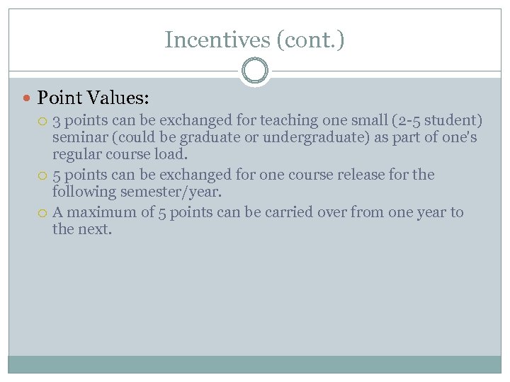 Incentives (cont. ) Point Values: 3 points can be exchanged for teaching one small (2 -5 student) seminar (could be graduate or undergraduate) as part of one's regular course load. 5 points can be exchanged for one course release for the following semester/year. A maximum of 5 points can be carried over from one year to the next.
