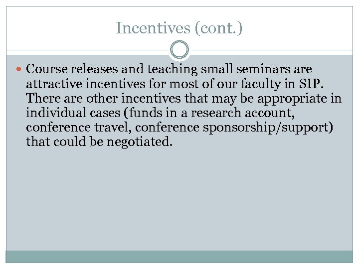 Incentives (cont. ) Course releases and teaching small seminars are attractive incentives for most of our faculty in SIP. There are other incentives that may be appropriate in individual cases (funds in a research account, conference travel, conference sponsorship/support) that could be negotiated.