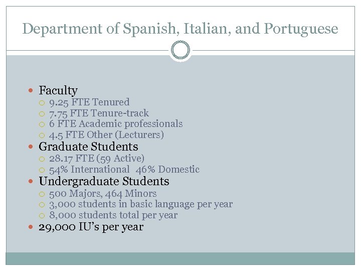 Department of Spanish, Italian, and Portuguese Faculty 9. 25 FTE Tenured 7. 75 FTE Tenure-track 6 FTE Academic professionals 4. 5 FTE Other (Lecturers) Graduate Students 28. 17 FTE (59 Active) 54% International 46% Domestic Undergraduate Students 500 Majors, 464 Minors 3, 000 students in basic language per year 8, 000 students total per year 29, 000 IU’s per year