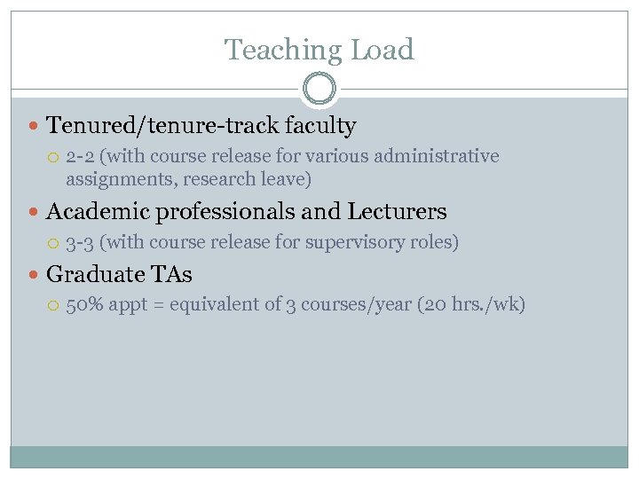 Teaching Load Tenured/tenure-track faculty 2 -2 (with course release for various administrative assignments, research leave) Academic professionals and Lecturers 3 -3 (with course release for supervisory roles) Graduate TAs 50% appt = equivalent of 3 courses/year (20 hrs. /wk)