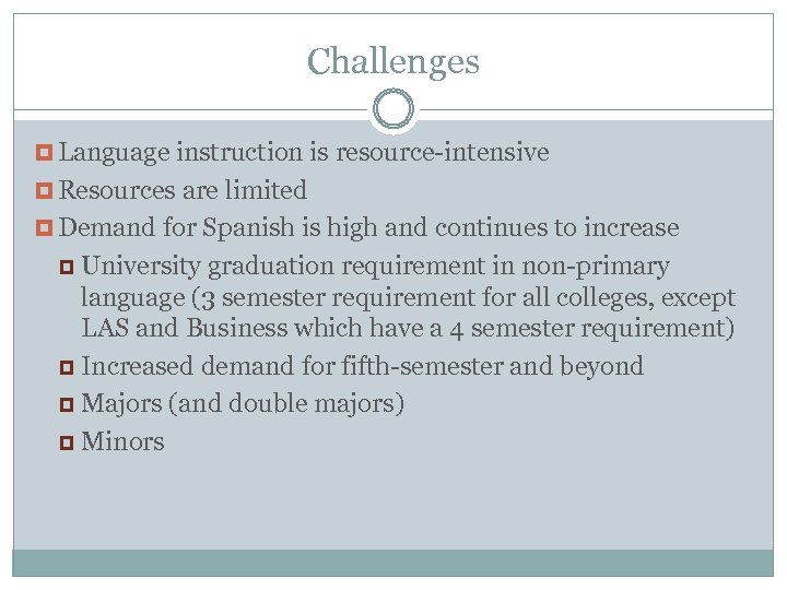 Challenges Language instruction is resource-intensive Resources are limited Demand for Spanish is high and continues to increase University graduation requirement in non-primary language (3 semester requirement for all colleges, except LAS and Business which have a 4 semester requirement) Increased demand for fifth-semester and beyond Majors (and double majors) Minors