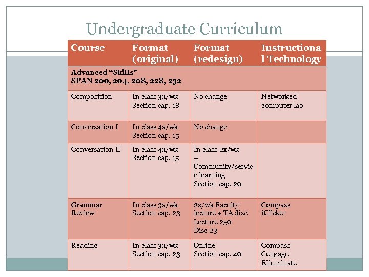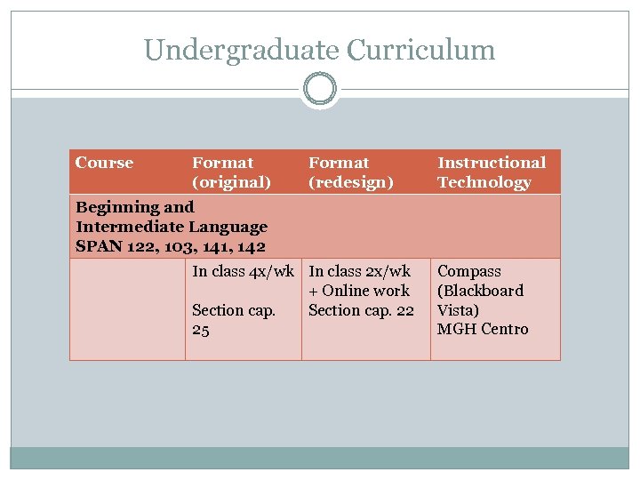 Undergraduate Curriculum Course Format (original) Format (redesign) Instructional Technology Beginning and Intermediate Language SPAN 122, 103, 141, 142 In class 4 x/wk In class 2 x/wk + Online work Section cap. 22 25 Compass (Blackboard Vista) MGH Centro
