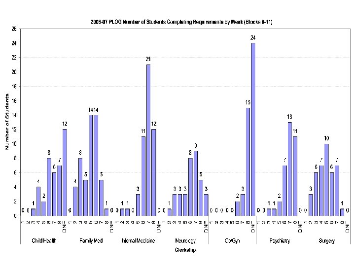 What did we learn? – Improved understanding of clinical exposure Each clerkship Across clerkships – Improved individual plans of study – Bringing the clerkship objectives into “focus” – Improved ability to see patterns in student performance across clerkships – Reasonable time commitment- most faculty and students spent one hour or less on PLOG each week. – High degree of user satisfaction