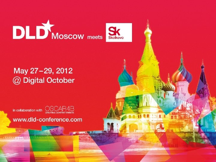meets Skolkovo – more details What DLD Moscow is a global conference network on innovation, digital, science and culture which connects business, creative and social leaders, opinion-formers and investors for crossover conversation and inspiration. When May 27 -29, 2012 Where Digital October and other Moscow Landmarks 5
