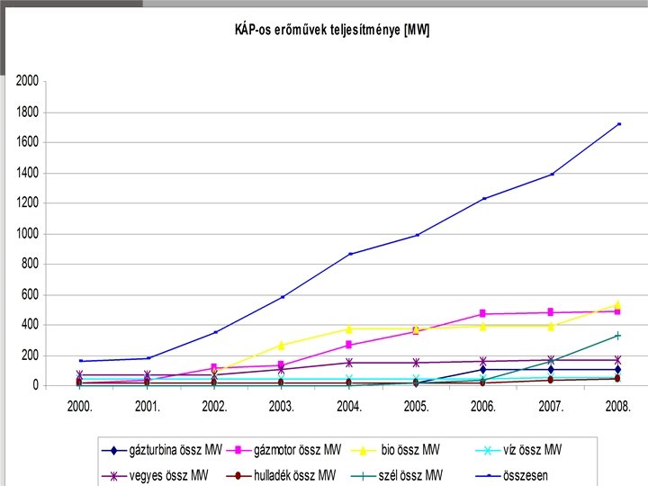 Kötelező átvételű termelés 50. 00 45. 00 10. 91 10. 76 10. 00 9. 66 40. 00 35. 00 33. 55 32. 27 8. 00 6. 01 25. 00 6. 00 5. 23 20. 00 18. 35 17. 05 13. 87 15. 00 13. 98 4. 00 13. 78 11. 00 10. 00 8. 05 2. 00 5. 61 5. 00 0. 86 0. 46 0. 98 0. 71 0. 39 0. 87 0. 59 0. 00 2003 2004 kapcsolt 2005 megújuló 2006 hulladék 2007 fajlagos támogatás 2008 Ft/k. Wh 7. 45 30. 00 Mrd Ft 12. 00 47. 58