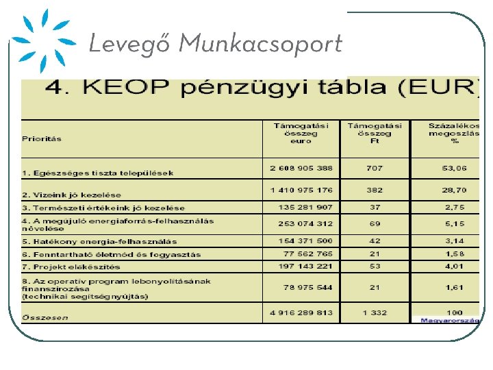 Támogatás – a „kicsi szép” helyett l nagyberuházásokra (2004 -es moratórium az erőművekre) l KIOP ( 125 milliós projektek) l Új Magyarország Nemzeti Fejlesztési Terv (National Reference Framework) 8 ezer mrdból 111 mrd jut az energiára l Nap, szél 23, 83 Ft/k. Wh l Egyebek 27 – 23, 83 – 9, 72 Ft/k. Wh
