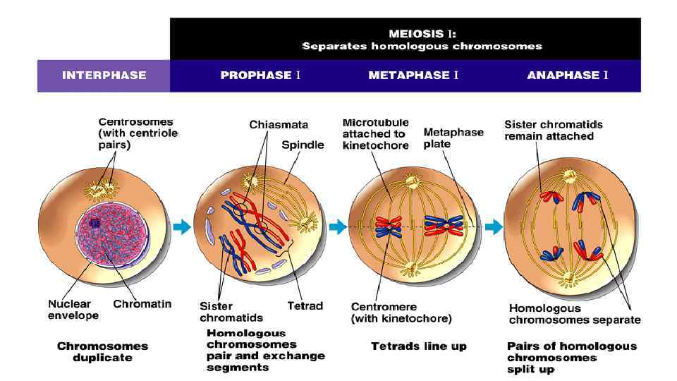 Prophase I • Chromosomes comes together in pairs, each pair called tetrad (complex of 4 chromatids) • Chromatids of chromosomes cross over and exchange the genetic material. • Nucleus membrane disappears • Centrioles moves to poles