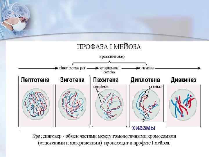 Исходная клетка имеет диплоидный набор хромосом, которые затем удваиваются. Но, если при митозе в каждой хромосоме хроматиды просто расходятся, то при мейозе хромосома (состоящая из двух хроматид) тесно переплетается своими частями с другой, гомологичной ей хромосомой (также состоящей из двух хроматид), и происходит кроссинговер.
