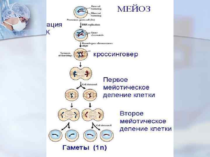 Процесс мейоза состоит из двух последовательных клеточных делений – мейоза I (первое деление) мейоза II (второе деление). Удвоение ДНК и хромосом происходит только перед мейозом I. В результате первого деления мейоза, называемого редукционным, образуются клетки с уменьшенным вдвое числом хромосом. Второе деление мейоза заканчивается образованием половых клеток