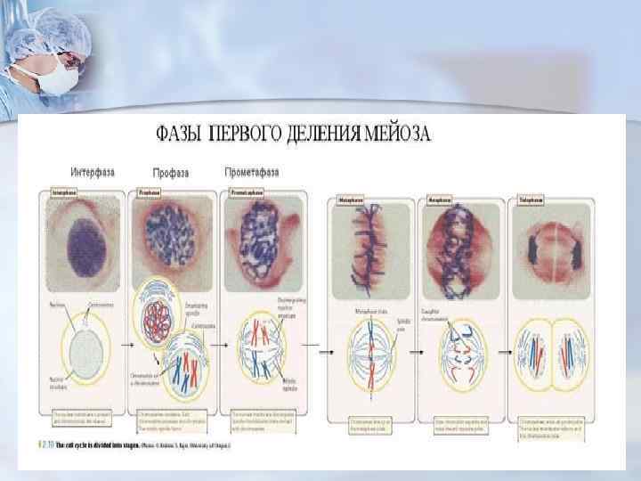 Первое деление мейоза Фазы Процессы Профаза I Спаривание гомологичных хромосом (одна из них материнская, другая - отцовская) Образование веретена деления. Расположение гомологичных хромосом по экватору Метафаза I Анафаза I Разделение пар хромосом (состоящих из двух хроматид) и перемещение их к полюсам. Телофаза I Образование дочерних клеток.