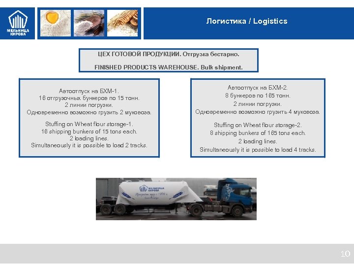 Логистика / Logistics Ценности МК ЦЕХ ГОТОВОЙ ПРОДУКЦИИ. Отгрузка бестарно. FINISHED PRODUCTS WAREHOUSE. Bulk shipment. Автоотпуск на БХМ-1. 16 отгрузочных бункеров по 15 тонн. 2 линии погрузки. Одновременно возможно грузить 2 муковоза. Автоотпуск на БХМ-2. 8 бункеров по 165 тонн. 2 линии погрузки. Одновременно возможно грузить 4 муковоза. Stuffing on Wheat flour storage-1. 16 shipping bunkers of 15 tons each. 2 loading lines. Simultaneously it is possible to load 2 tracks. Stuffing on Wheat flour storage-2. 8 shipping bunkers of 165 tons each. 2 loading lines. Simultaneously it is possible to load 4 tracks. 10