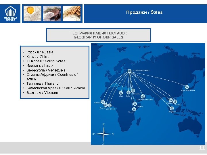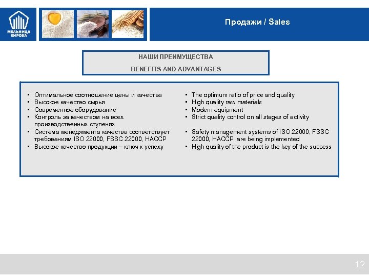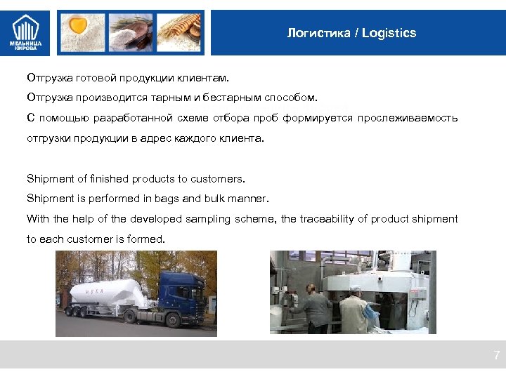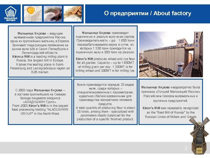 Ценности МК О предприятии / About factory Мельница Кирова – ведущее мукомольное предприятие России, одна из крупнейших мельниц в Европе. Занимает лидирующее положение на рынке муки b 2 b в Санкт-Петербурге и Ленинградской области. Kirov; s Mill is a leading milling plant in Russia, the largest mill in Europe. It takes the leading place in Saint. Petersburg and Leningradskaya region on B 2 B market. C 2003 года Мельница Кирова – в составе крупнейшего на Северо. Западе пищевого холдинга «АЛАДУШКИН Групп» . From 2003 Kirov’s Mill is in the largest food processing holding "ALADUSHKIN GROUP" in the North-West. Мельница Кирова производит пшеничную и ржаную муку всех сортов. Производительность – до 1 650 тонн перерабатываемого зерна в сутки, из которых 1 350 тонн приходится на пшеничную муку и 300 тонн на ржаную. Kirov’s Mill produces wheat and rye flour for all grades. Capacity – up to 1 650 MT of milling grain per day. 1 350 MT is for milling wheat and 300 MT is for milling rye. Всего производится порядка 35 видов муки, среди которых – специализированные с параметрами, идеально сбалансированными для производства конкретного готового продукта. A total quantity of producing flour is about 35 kinds, among them - specialized with parameters ideally balanced for the production of a specific finished product. Мельница Кирова неоднократно была признана «Лучшей Мельницей России» Российским Союзом мукомольных и крупяных предприятий. Kirov’s Mill was repeatedly recognized as the "Best Mill of Russia" by the Russian Union of Millers and Groats 2