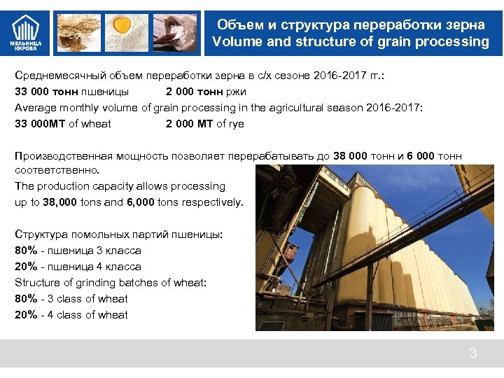 Объем и структура переработки зерна Volume and structure of grain processing Среднемесячный объем переработки зерна в с/х сезоне 2016 -2017 гг. : 33 000 тонн пшеницы 2 000 тонн ржи Average monthly volume of grain processing in the agricultural season 2016 -2017: 33 000 MT of wheat 2 000 MT of rye Производственная мощность позволяет перерабатывать до 38 000 тонн и 6 000 тонн соответственно. The production capacity allows processing up to 38, 000 tons and 6, 000 tons respectively. Структура помольных партий пшеницы: 80% - пшеница 3 класса 20% - пшеница 4 класса Structure of grinding batches of wheat: 80% - 3 class of wheat 20% - 4 class of wheat 3