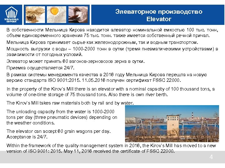 Элеваторное производство Elevator В собственности Мельница Кирова находится элеватор номинальной емкостью 100 тыс. тонн, объем единовременного хранения 75 тыс. тонн. также имеется собственный речной причал. Мельница Кирова принимает сырье как железнодорожным, так и водным транспортом. Мощность выгрузки с воды – 1000 -2000 тонн в сутки (тремя пневматическими устройствами) в зависимости от погодных условий. Элеватор может принять 60 вагонов-зерновозов зерна в сутки. Приемка осуществляется 24/7. В рамках системы менеджмента качества в 2016 году Мельница Кирова перешла на новую версию стандарта ISO 9001: 2015. 11. 05. 2016 получен сертификат FSSC 22000. In the property of the Kirov’s Mill there is an elevator with a nominal capacity of 100 thousand tons, a volume of one-time storage of 75 thousand tons. Also there is own river berth. The Kirov’s Mill takes raw materials both by rail and by water. The unloading capacity from the water is 1000 -2000 tons per day (three pneumatic devices) depending on the weather conditions. The elevator can accept 60 grain wagons per day. Acceptance is 24/7. Within the framework of the quality management system in 2016, the Kirov’s Mill has moved to a new version of ISO 9001: 2015. May 11, 2016 received the certificate of FSSC 22000. 4